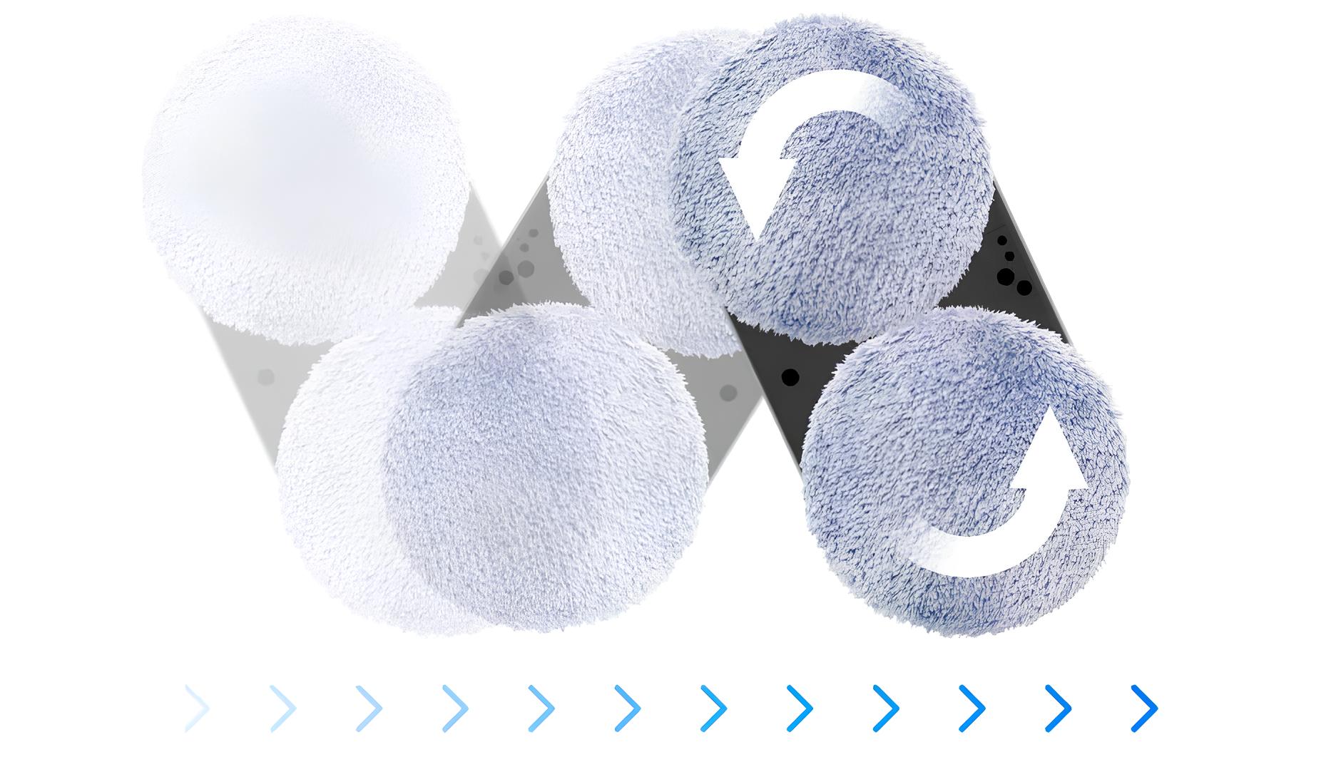 Вращающиеся диски с салфетками из микрофибры (скорость до 70 оборотов в минуту) имитируют движения руки человека, удаляя загрязнения без разводов. Прижимная сила 5 кг обеспечивает надёжное сцепление и эффективное всасывание пыли.